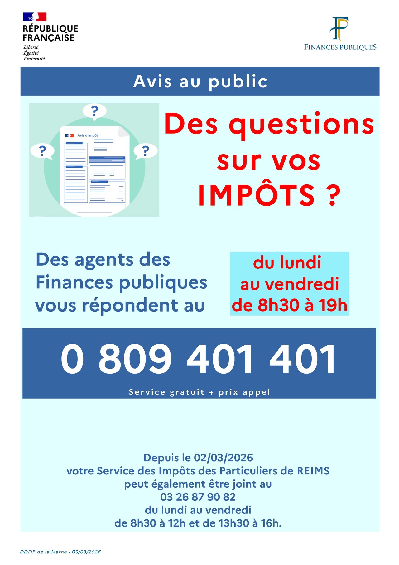 Depuis le 02/03/2026 votre service des impôts des particuliers de Reims peut également être joint au 03.26.87.90.82 du lundi au vendredi de 8h30 à 12h00 et de 13h30 à 16h00.